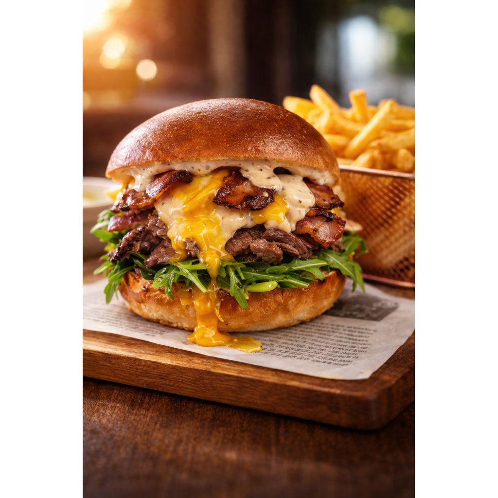 rib eye steak 200g, dvojitá porce vypečené slaniny, dvojitá porce čedaru, karamelizovaná cibulka, rukola, vejce, dijonéza