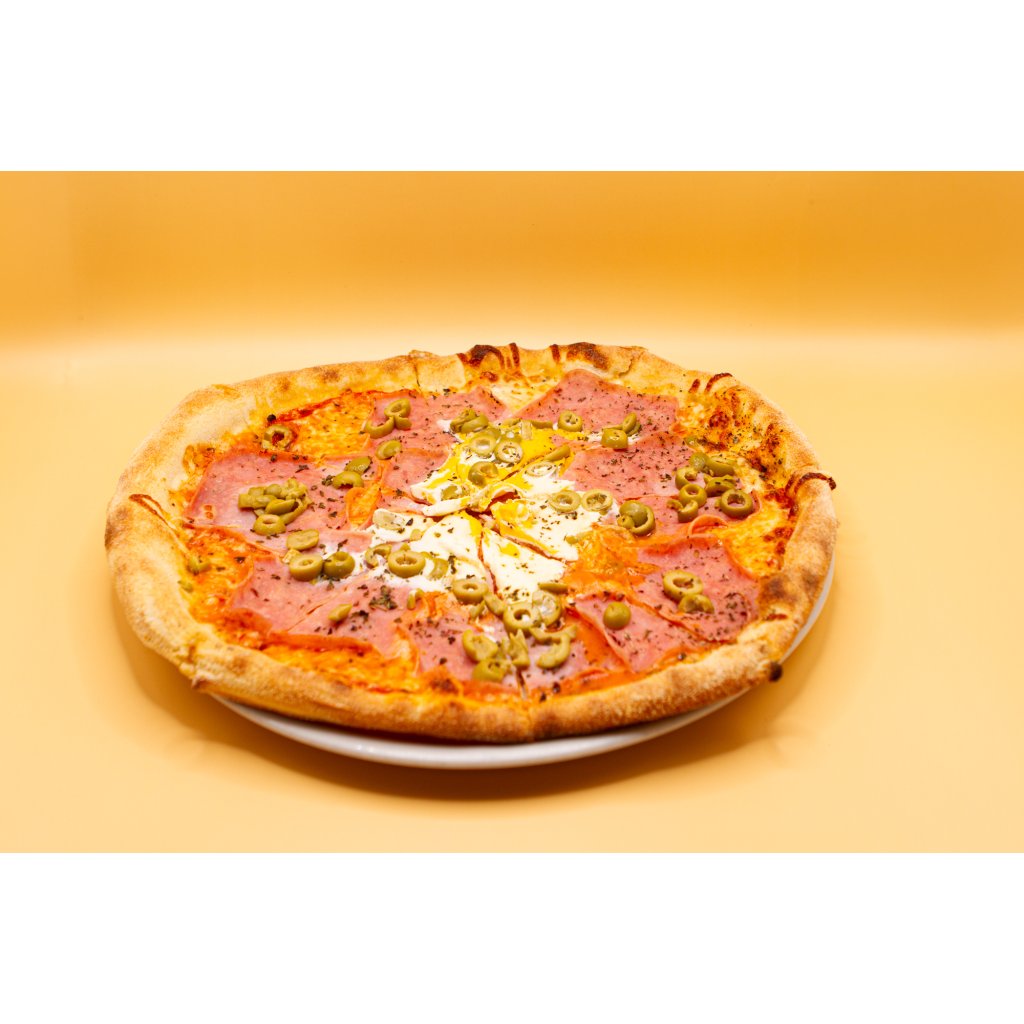 tomatové sugo, mozzarella, šunka, vejce, olivy, oregano